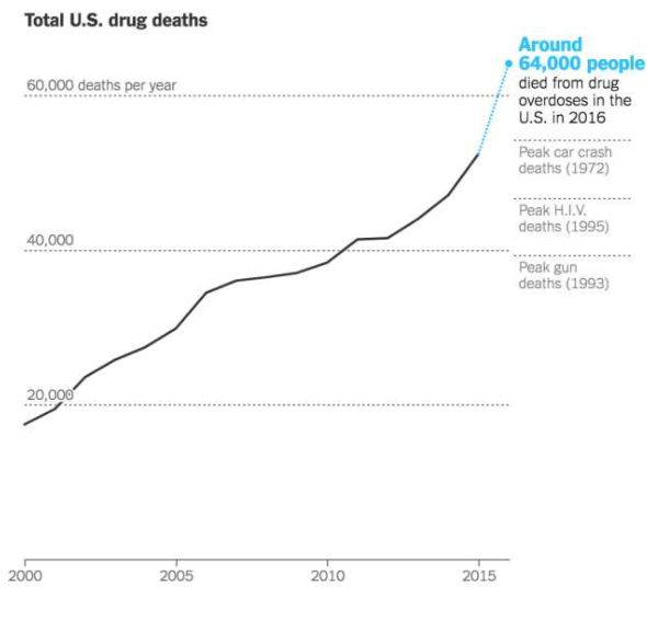据纽约时报报道,全美平均每天因用毒过量而死亡的人数高达142人。2016年美国有64000人因过度吸毒而死亡,这个人数远远高于由枪支造成的死亡数量,几乎接近两倍。