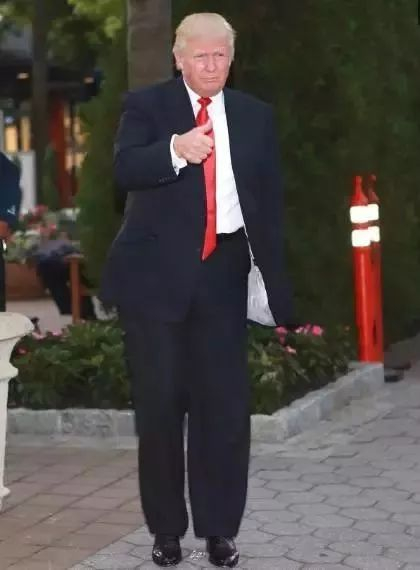 西装是特朗普的标配,而与他的西装常配的则是一条超长的红色领带。
