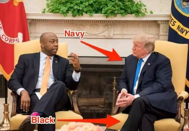 这种蓝色条纹的领带也是特朗普最钟爱的配饰之一,他所有领带几乎无一例外都会很长,拖到了裤腰下面很长的地方,让人感觉拖沓,似乎想要掩盖什么似的感觉。