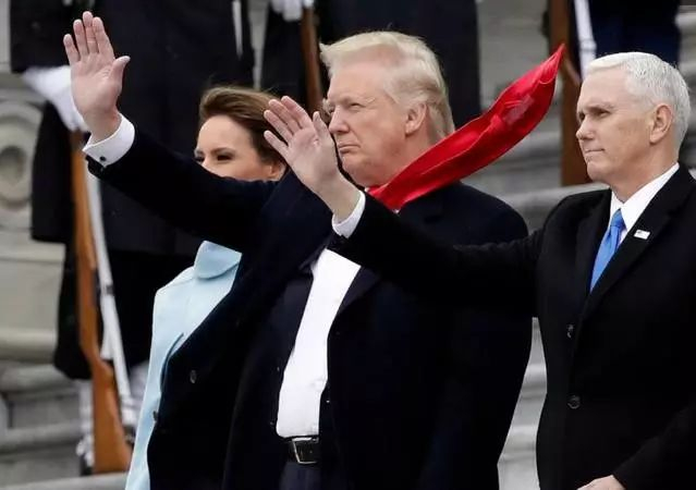 最让人大跌眼镜的是,被风刮起的领带背面竟然贴上了胶带纸以便固定,大概特朗普也没有想到就职仪式上该死的风会如此给他揭短。