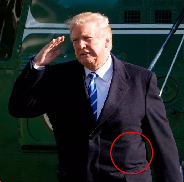 特朗普身穿一件深蓝色大衣,网友注意到照片中大衣外表很不平整,看起来像是在衣服里藏了什么东西。