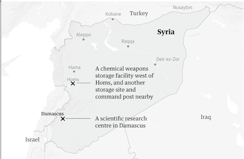 图示为此次空袭所打击的目标:大马士革地区的科研中心,叙利亚西部城市霍姆斯以西的化武据点。