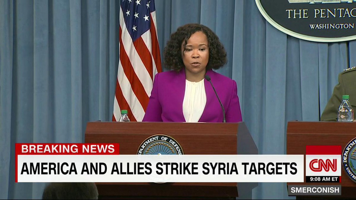 当地时间14日,美国防部在五角大楼召开记者会,介绍对叙利亚进行精准打击的情况。发言人达纳•怀特表示,世界上任何地方使用化学武器都是不可原谅、且违反国际法的行为,美国不会容忍,必须实时回击。她强调,昨天的空袭成功执行,每个导弹都是“精心策划和有计划地”发射,减少平民伤亡。“这是对叙利亚使用化学武器的正当、合理和符合比例原则的响应。”