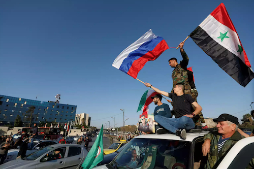 大马士革街头,人们聚集游行,有民众挥舞着叙利亚和俄罗斯两国国旗。