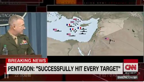 美国国防部长马蒂斯称:“我确信叙利亚政权在上周对无辜民众进行化学武器攻击,绝对确信。空袭目标经过谨慎的选择与分析,此刻空袭已结束。”马蒂斯称,截至目前,这是一次性的空袭,“我相信这送出非常强大的讯息劝阻他(阿萨德),并阻止吓阻他再次进行(化武攻击)”。