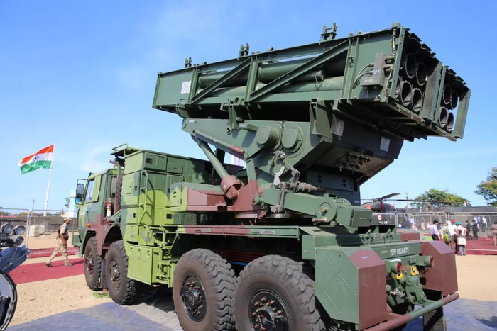 防务展上展示的印度皮纳卡远程火箭炮。(新华社记者赵旭摄)