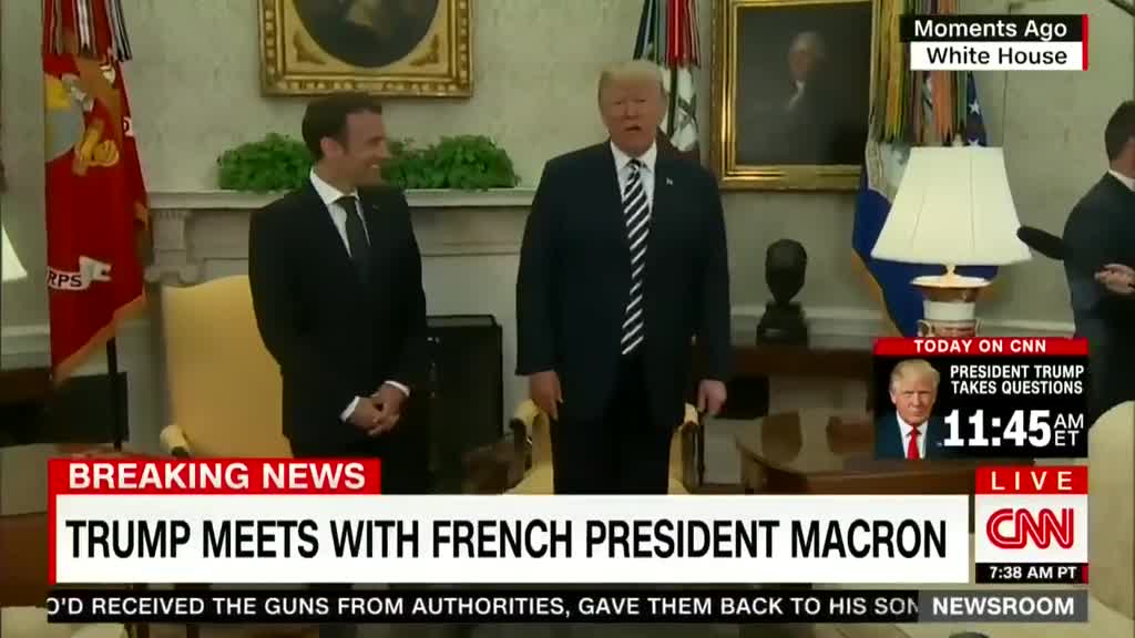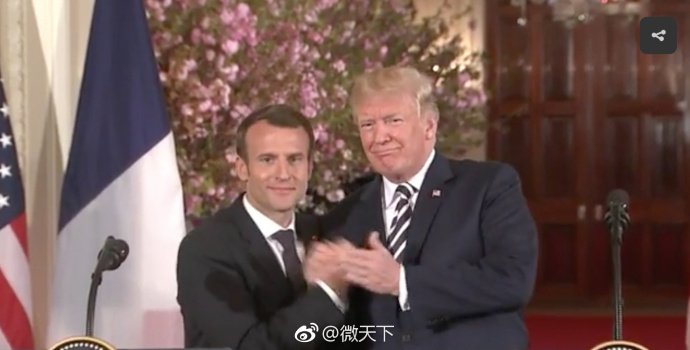 时隔9个月,在华盛顿,特朗普再次表现出对马克龙的欣赏和赞美。他先是在欢迎辞中感谢法国,参与了本月14日美国针对叙利亚使用化学武器而发动的空袭行动。他表示,过去一年中他与马克龙建立了“美好的友谊”,这就是两国长久友谊的证明。