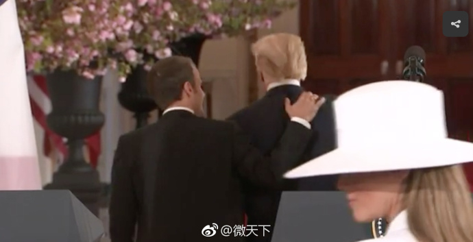在当天的欢迎仪式上,特朗普多次对媒体炫耀他和马克龙的交情。他说,媒体都说我们的关系好,这次终于不是假新闻了!“很荣幸在这里见到你,我们确实关系很好”。接着,他开始放飞自我,在马克龙的衣服上拍了拍,并说道:“我现在就要帮你把衣服上的头皮屑掸掉”。听特朗普此言,马克龙显然有些吃惊。而特朗普不顾在一旁尬笑的他,转身又对媒体说:“他(马克龙)太完美了!你是我很特别的一位朋友。”