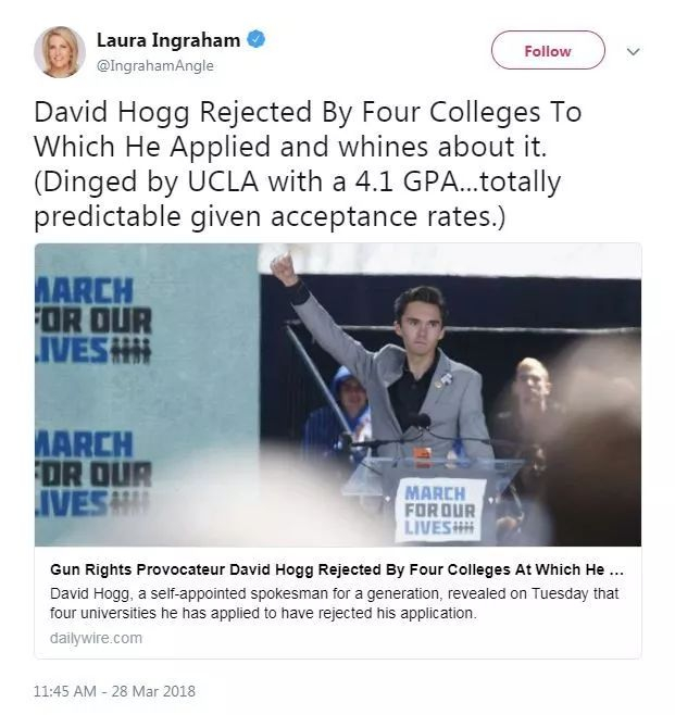 甚至,读书本身也可能成为需要暂缓的事情。媒体报道,学生活动者David Hoggs申请了数所加州学校的新闻专业,在被大家熟知的UCLA,UCSD发了拒信之后陆续收到了CalPoly等学校的录取通知书[2][3]。当记者问起他的读书选择时,他说他甚至没有想好是马上去上学还是先Gap一年,“毕竟组织游行,推动控枪的事情已经忙不过来了”。