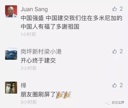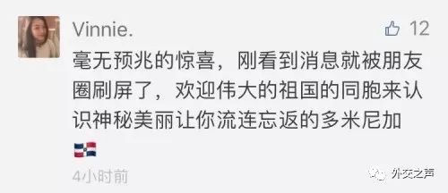 建交消息传来,多米尼加侨胞振奋不已!他们纷纷在第一时间将喜悦分享给亲朋好友,有侨胞兴奋地写下:“这是毫无预兆的惊喜”,“欢迎伟大的祖国的同胞,来认识神秘美丽、让你流连忘返的多米尼加!”