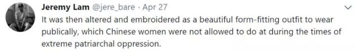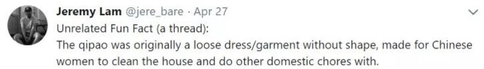 Jeremy Lam后来还在帖文下连续留言给大家科普旗袍背后的历史和文化意义: