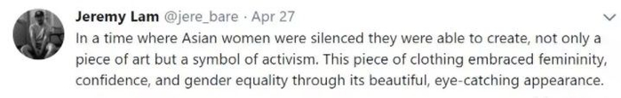 “我为自己这段文化感到自豪。中式旗袍不应该成为美国消费主义的对象,迎合白人受众。”