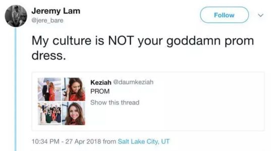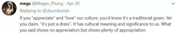 “如果你真的欣赏和喜爱我们的文化,你应该知道这是我们的传统服饰。但是你却说:这就是条裙子。你口中的这条裙子拥有很多文化含义,对我们意义非凡。要我说,这不是文化欣赏,而是文化挪用。”