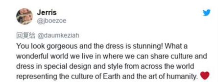 “你看起来超美,这条裙子也很美。我们生活的这个世界多么美好,我们可以分享世界各地的文化、服饰和艺术。”