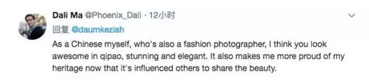 “我是一个中国人,也是一名时尚摄影师。我觉得你穿旗袍很好看、很优雅,能与世界与他人分享我们的文化和美,我很自豪。”
