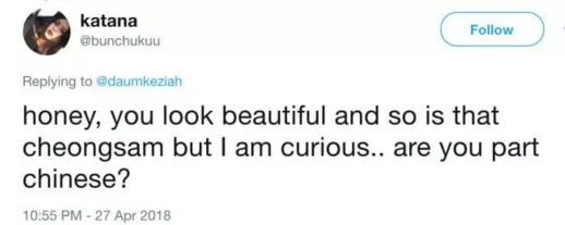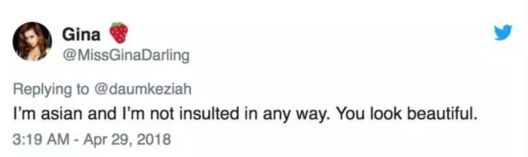 “我是亚裔,我没觉得被冒犯了。你看起来很美!”