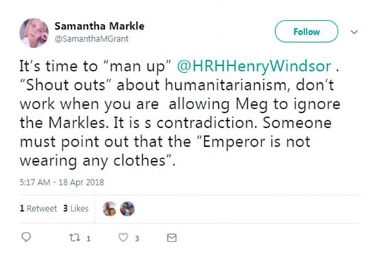 今年4月,梅根同父异母的姐姐Samantha Grant就曾发推特斥责,在多达二千人参加的婚礼上有一千多名陌生人,梅根却不邀请家人参加。