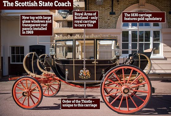如果婚礼当天是晴天就用左边的Ascot Landau马车,如果不幸运遇到了下雨天就选用右边有顶棚的Scottish State Coach。