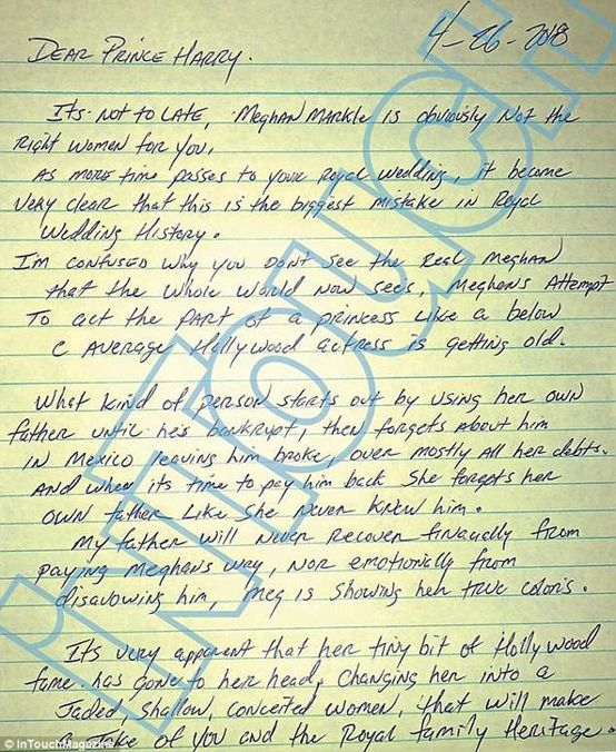 梅根同父异母的的哥哥,来自美国俄勒冈州的Thomas Markle Jr向媒体公开了一份写给哈里王子的亲笔信。