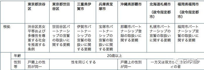 截止目前,日本有7处自治区通过了《伴侣证明书》条例。它们分别是:东京都涉谷区、东京都世田谷区、三重县伊贺市、兵库县宝冢市、冲绳县那霸市、北海道札幌市、福冈县福冈市。