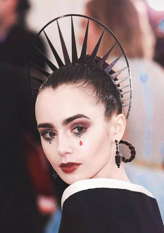 搭配以Our Lady of Sorrows为灵感的红色泪珠眼妆。