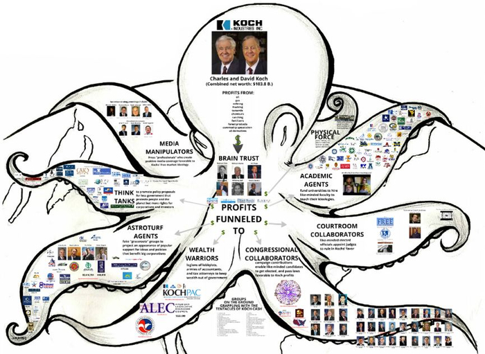 芬克的计划为查尔斯·科赫量身定做,后者深深服膺哈耶克,并且以工程师的系统思维处理商业和政治。虽然有些人觉得视民主过程为一个工厂令人不安,但查尔斯很快采用了这一方法。他告诉自由至上主义作家布莱恩·多尔蒂,“实现社会变革需要纵横一体的策略”。他说,它必须从“思想创造”转变“到政策发展,到教育,到基层组织,到游说,到政治行动”。不久之后,打趣的自由至上主义者将科赫兄弟不愿曝光的多臂装配线戏称为“科赫章鱼”(Kochtopus),这一名称一直沿用下来。