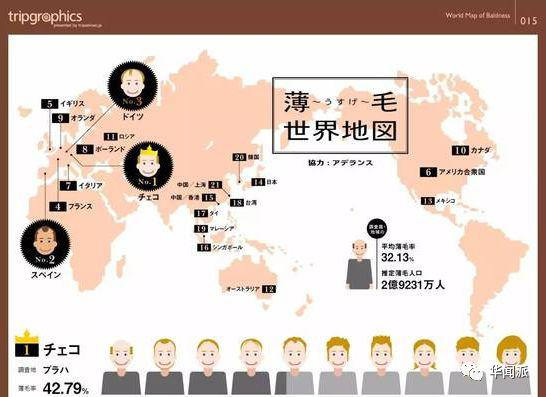 日本虽然是亚洲秃顶率最高的国家,但其26.78%的秃顶率仍然只能位居全球第13,而中国秃顶率最高的上海市,是第21名。这张图虽然用色温和,但“薄毛”两个字扎心了……