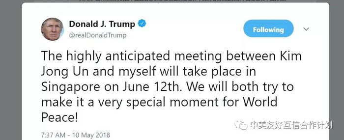 北京时间5月11日,美国总统特朗普宣布,将于6月12日在新加坡与朝鲜最高领导人金正恩进行会晤。目前,还不确定双方的会谈会持续多久。这将是现任美国总统首次与朝鲜最高领导人会面。