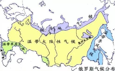 俄罗斯大部分地区所处纬度较高,属于温带和亚寒带大陆性气候,冬天漫长,夏季短暂,温差大,降水少。