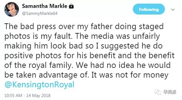 现在父亲爆出假照片事件后,萨曼莎又来“蹭热度”,主动发推还@肯辛顿宫,说父亲拍照都怪她,是她的点子,因为她觉得媒体对她父亲不公平,让他看起来“很糟”。最好的办法就是拍一些“正面的照片”,这样对她的父亲和英国王室都好,还说“我们不知道他会拿这些照片来赚钱,我们不是为了钱”。