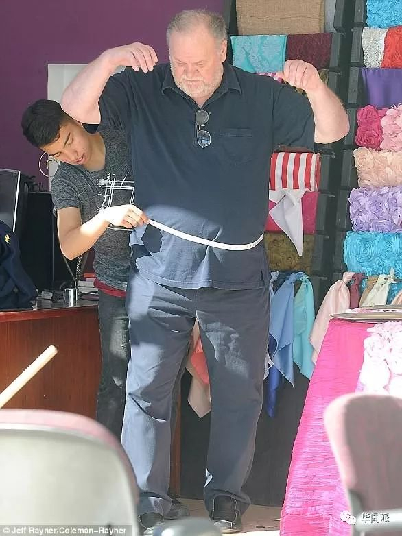 这是一张马克尔在一家看似裁缝店的店里“量体裁衣”的照片,其实这家店并不是一家裁缝店,而是一家派对用品商店。