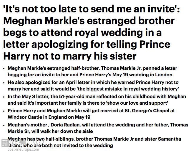 我们都知道,梅根有一群戏精亲戚,以她同父异母的哥哥姐姐为首,每次哈里和梅根一有什么动向,这群人就要出来自己找存在感。欧洲菌此前已经推送过多次,复习戳:梅根哥哥写公开信劝哈里王子取消婚礼!因为他妹妹婚礼竟然连老爸都没邀请。。。这封大义灭亲的公开信也就是几天之前的事儿,当时成功登上了各大媒体的头条,不过王室对此没有做出任何回应。不甘被冷落的梅根哥哥眼见着写信不见成效,立刻又改口诚恳道歉,希望妹妹梅根网开一面,能邀请他出席婚礼。。。