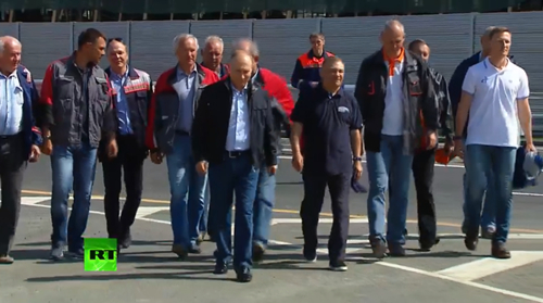 当天,普京身穿牛仔裤和防风夹克,驾驶一辆Kamaz卡车,带领车队驶过大桥。他的车上还坐着两位参与大桥建设的工人。