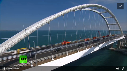 15日,连接俄罗斯本土与克里米亚半岛的克里米亚大桥举办通车仪式,俄罗斯总统普京亲自驾驶卡车参加。俄罗斯卫星网报道,这座19千米长的大桥提前了6个月完工,将成为欧洲最长的桥梁,于明日正式通车。