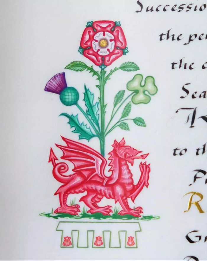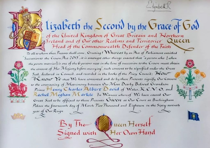 The Instrument of Consent is drafted by the Crown Office and is, in the case of Prince Harry‘s marriage, hand-written and illuminated onvellumby one of a panel ofscrivenerartists retained by the Crown Office。 Vellum is used only for important State documents。