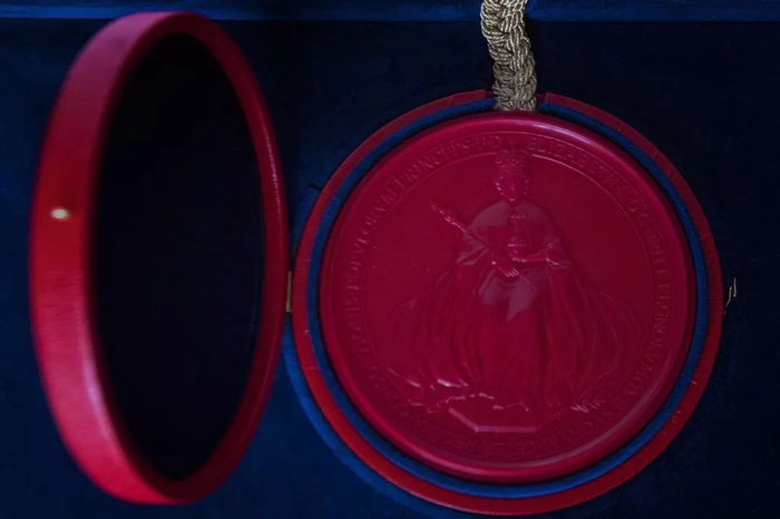 The Instrument of Consent is sealed with the Great Seal of the Realm, which is attached to the foot of the document by woven cords sealed within the Great Seal itself。