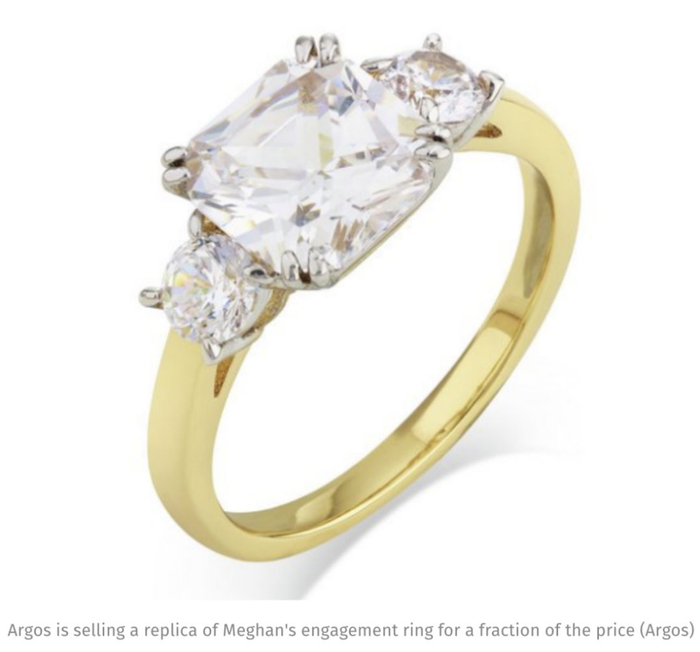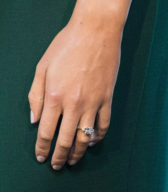 这枚闪耀的黄金钻戒是由哈里王子亲自设计,中间的大钻来自南非博茨瓦纳,是这对新人曾去度假的地方,两侧的两个小钻石则取自戴安娜的收藏。