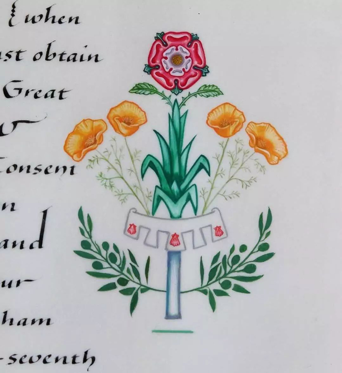 The design to the right of the text also includes the rose, as this is also the national flower of the United States。 To either side of the rose are two golden poppies – this being the state flower of California, where Ms Markle was born。 Between the flowers is the Welsh leek, together with Prince Harry’s Label。 Beneath the Label are olive branches, adopted from the Great Seal of the United States。