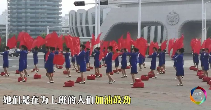 这可不是“中国大妈”的健身广场舞,而是朝鲜文工队组织的专项活动。她们肩负着一项崇高而伟大的任务:那就是为每天早上奔赴工作岗位的人们加油鼓劲。
