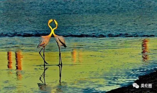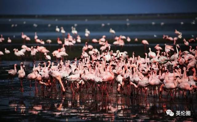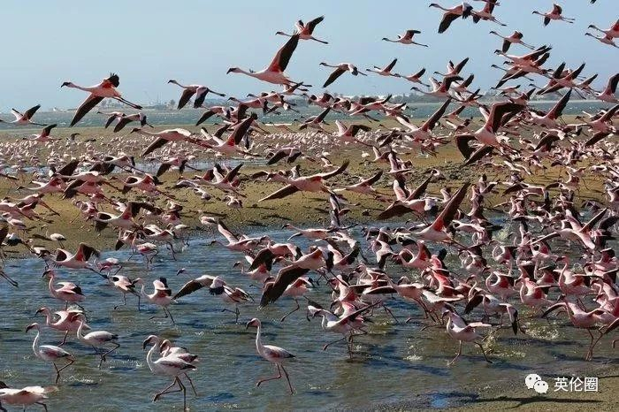 其中火烈鸟是纳米比亚的一大亮点,其体羽白而带玫瑰色,与湛蓝色的海水行成强烈的比对。
