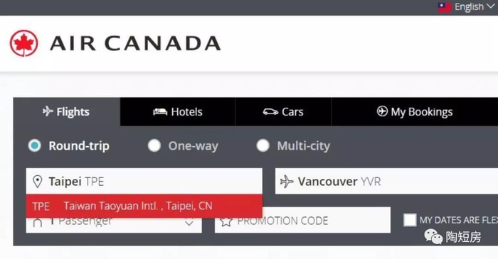 3、订票网页上台北桃园机场被标注CN,但页面右上角的旗帜未改(Chính‘s News)
