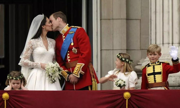 照片里的小孩子其实是婚礼的伴娘(Bridesmaid),这里解释一下,根据英国王室的传统,婚礼上通常会由一群小孩子担任Bridesmaids和Page Boys,女孩子叫Bridesmaid(伴娘),男孩子叫Page Boy(花童)。这些小孩子除了有王室成员之外,也有来自跟王室关系密切的家庭的小孩,例如这个“不高兴脸”小女孩就是威廉王子的教女。