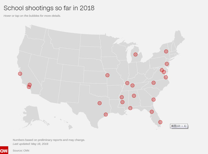 5月18日,美国又发生两起校园枪击案,其中发生在得州圣达菲高中的枪击案造成10人死亡,10人受伤,遇难者多为学生。美国总统特朗普在事后的演讲中称,几十年来,这类事件在美国不断重复上演。而据美国媒体CNN报道,2018年才刚走到第20周,美国境内就已经发生了23起有死伤的校园枪击案。平均每一周都发生至少一起枪击案。