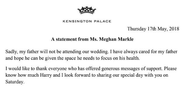 梅根不堪其扰,发表最新声明,确认自己的父亲因为健康问题,将不会出席婚礼。