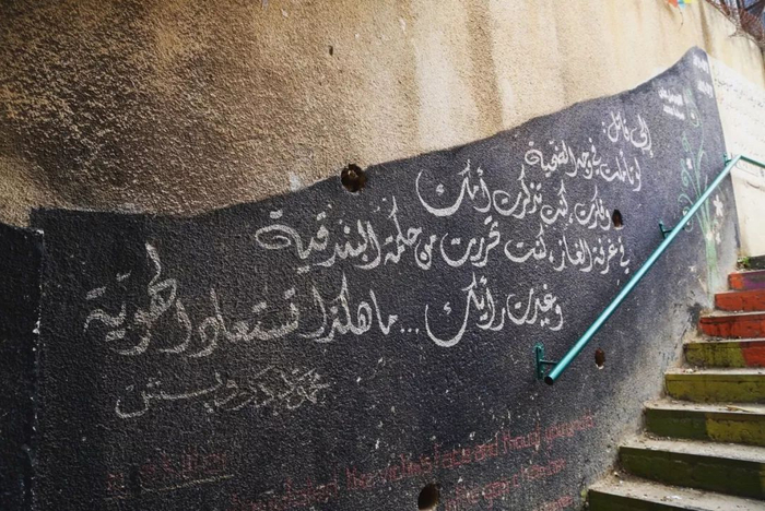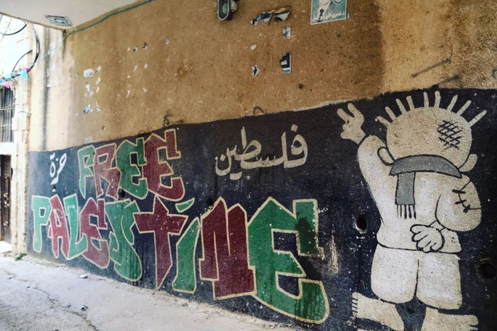 解放巴勒斯坦涂鸦(涂鸦中男孩的手势是该作者的特定手势,后遭以色列当局迫害死于黎巴嫩)