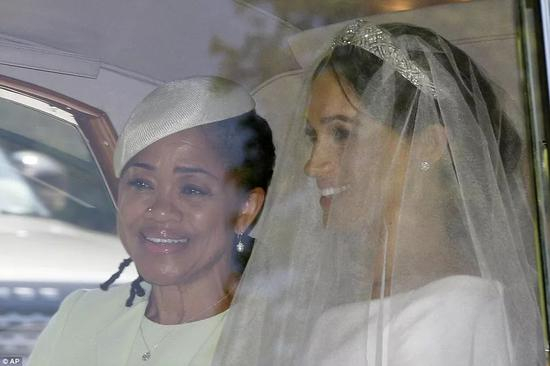 11点多,新娘出现,梅根与母亲乘劳斯莱斯从酒店前往婚礼现场。