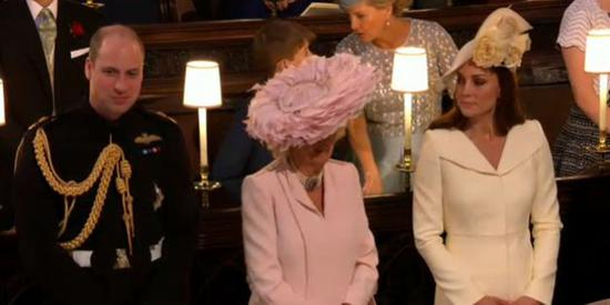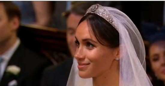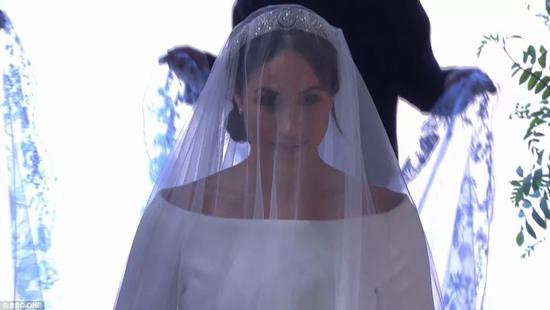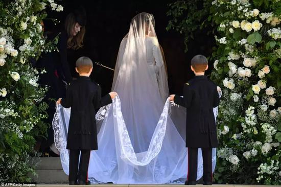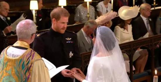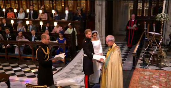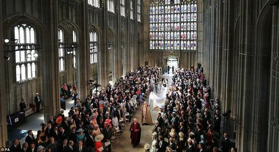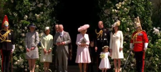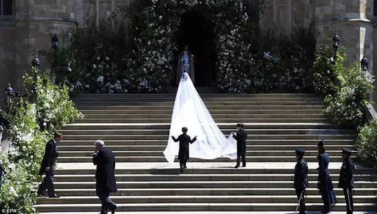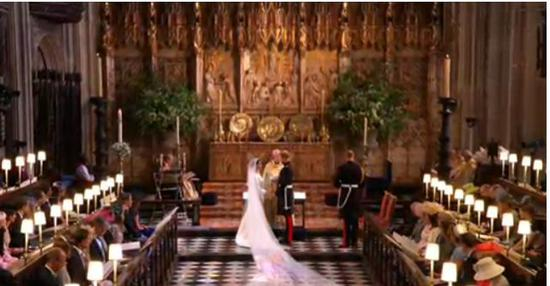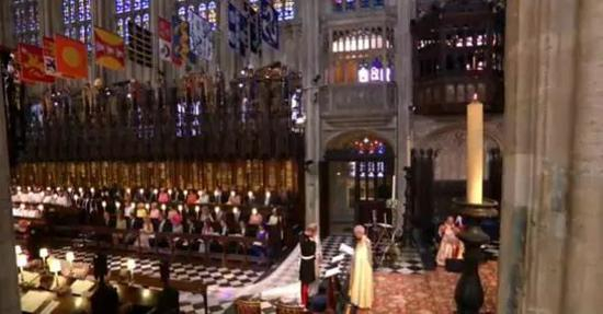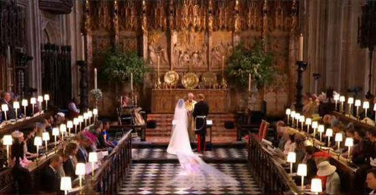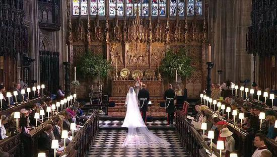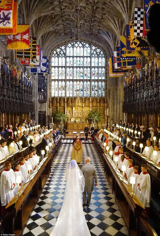 梅根独自进礼拜堂,在花童尾随下,走过一段红毯之后,才由查尔斯“护送”走到祭坛前。