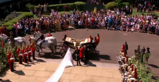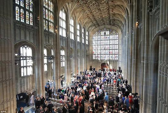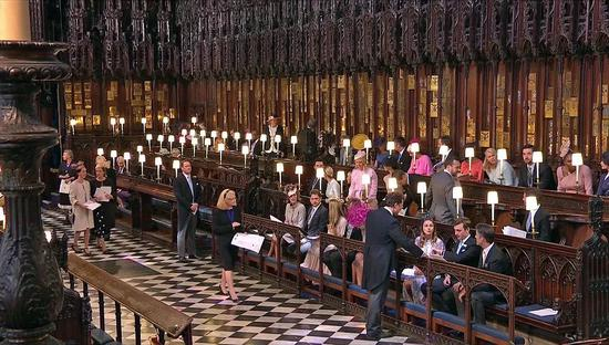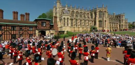 上午9点30分之后,婚礼宾客出发前往温莎城堡最著名的圆塔,随后从南门进入圣乔治礼拜堂入座。