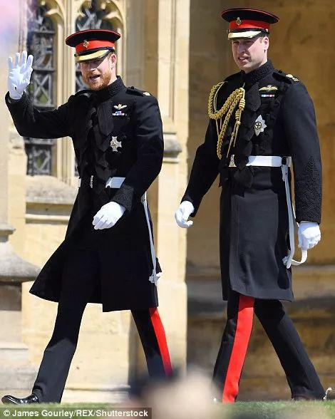 11点30多,新郎哈里王子和他的哥哥、伴郎威廉王子穿军服出现,终究,哈里的胡子还是没刮。