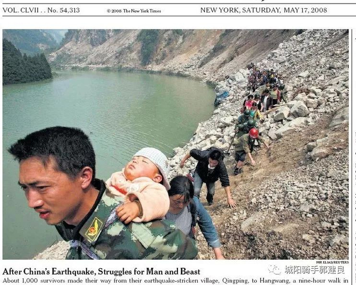 2008.05.17 纽时头条照片是灾民转移,突出的重点是军人背着一个熟睡的婴儿。